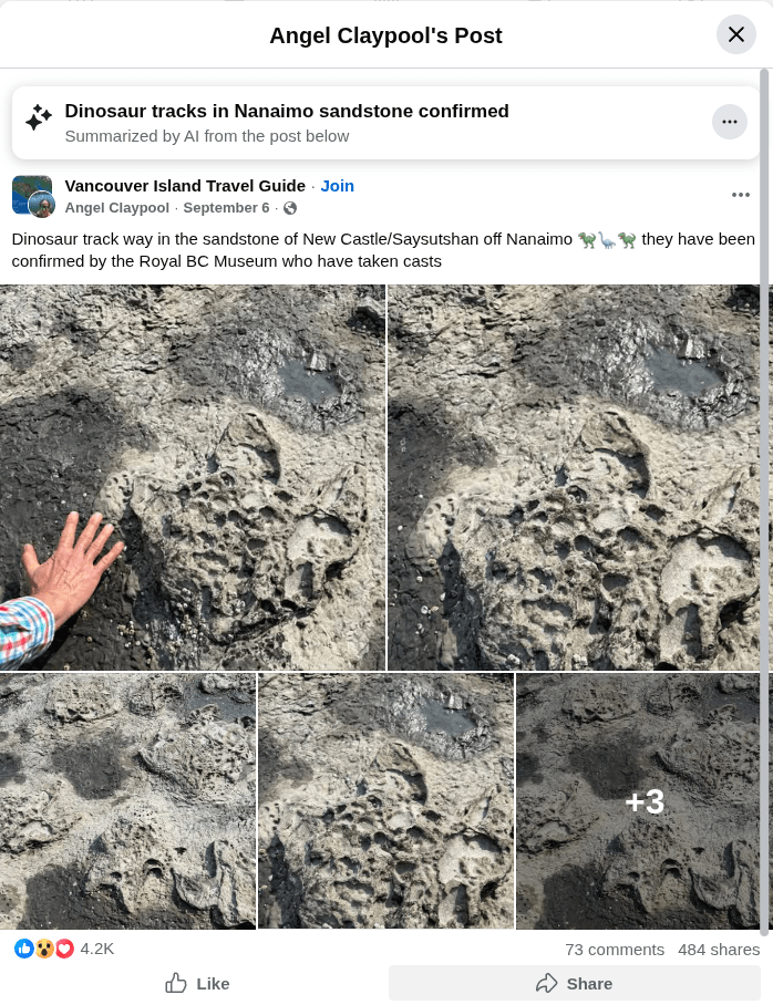 Footprints of dinosaurs and other ancient creatures are being discovered elsewhere in BC, so why not at our usual sites here on the Island? What do we look for, and how do we know these traces when we find them?